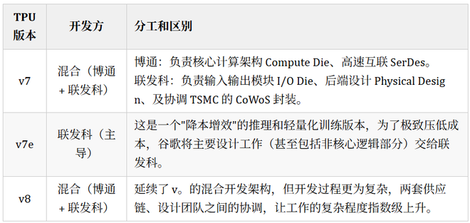 TPU目前 v7、v7e、v8 版本的开发归属如下: