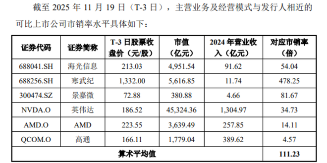 上市公告书里藏着一个令人咋舌的细节。在发行价114.28元时,摩尔线程对应的静态市销率(P/S)就已经高达122.51倍。公告书甚至非常诚实地直言,这个数字“高于同行业可比公司平均水平”。而随着上市首日股价翻了4倍以上,其动态市销率实际上已经突破了500倍。