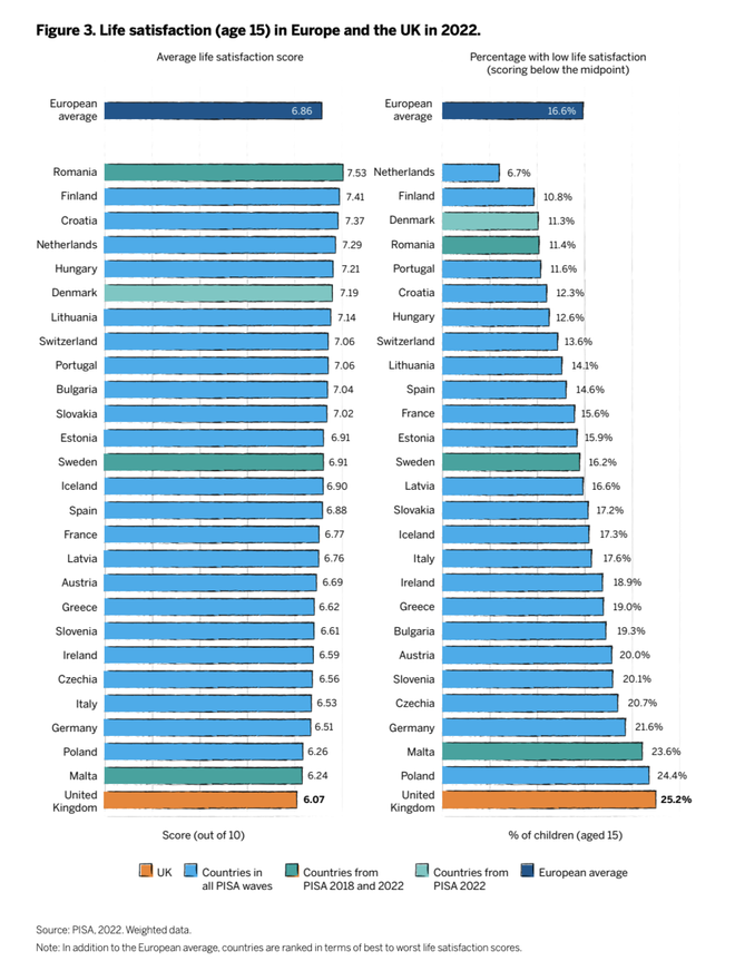 而在27个受调查的国家中,英国是问题最严重的国家:在平均15岁的英国青少年中,有25.2%对生活感到不满意。