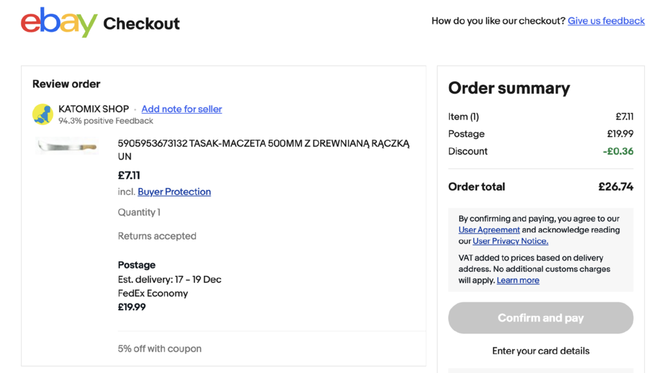 结果显示,虽然大部分网站会显示“未满十八岁的人禁止买刀,因此购物时需要ID照片,并且派件时需要本人签名”。但ebay等二手购物网站管理却显得比较松散,直接用路人身份外加地址和银行卡信息便可以下单了。