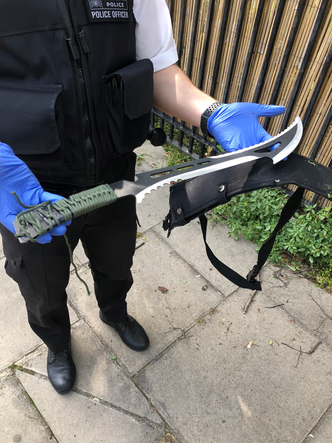 根据英格兰和威尔士的统计数据,在2023年,这类大型刀具在超过14000份犯罪记录中被提及,其中有近10000把是砍刀,出现次数是五年前的两倍。