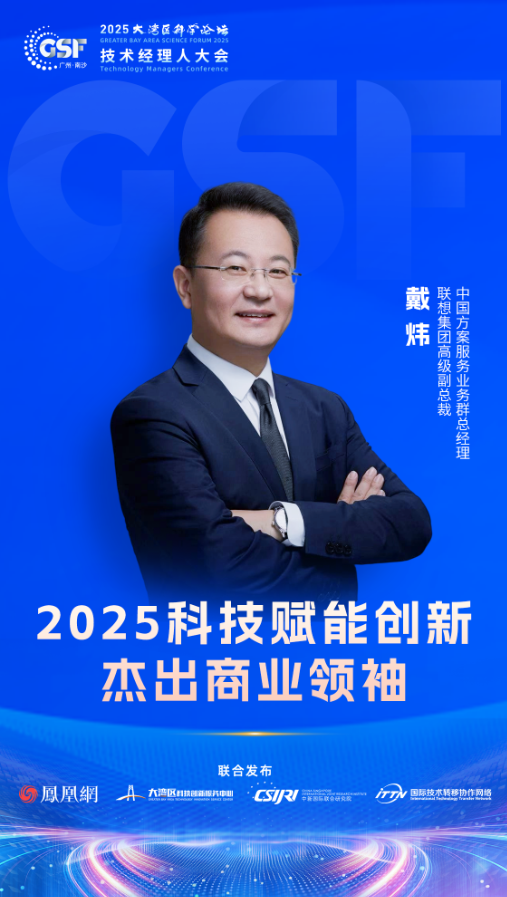 在大湾区科学论坛技术经理人大会上,凤凰网、大湾区科创服务中心、中新国际联合研究院、国际技术转移协作网络(ITTN)联合授予联想集团高级副总裁、中国方案服务业务群总经理戴炜“2025科技赋能创新--杰出商业领袖”称号。