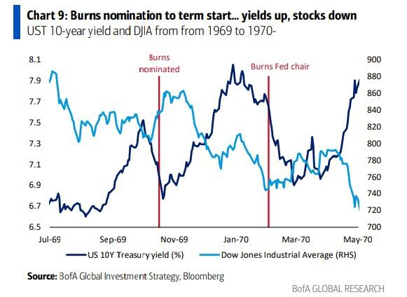值得注意的是,从尼克松1969年10月提名Arthur Burns到1970年2月其任期开始,美国10年期国债收益率上升100个基点,道琼斯指数下跌11%。