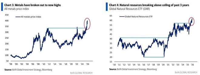 他强调,自然资源、金属以及拉美股市(今年迄今已上涨56%)正全面突破。在被市场长期冷落的商品领域,Hartnett特别看好石油和能源板块,认为这是2026年最佳的逆向投资机会