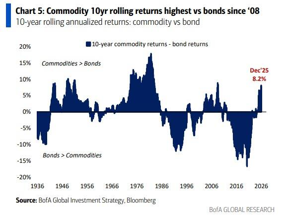 这一判断的核心逻辑在于经济政策范式转变:全球金融危机导致货币过度宽松但财政紧缩,令债券在长期停滞时代表现优于大宗商品;而新冠疫情后的财政过度宽松加上全球化终结,使得大宗商品在2020年代的民粹主义和通胀性增长时代表现优于债券。![]()