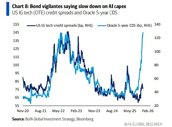 Hartnett认为,流动性峰值对应信用利差谷底,债券警惕者正在成为AI资本支出的新监管者,要求放缓增长,因为超大规模云服务商的资本支出占现金比例从2024年的50%(2400亿美元)跃升至2026年的80%(5400亿美元)