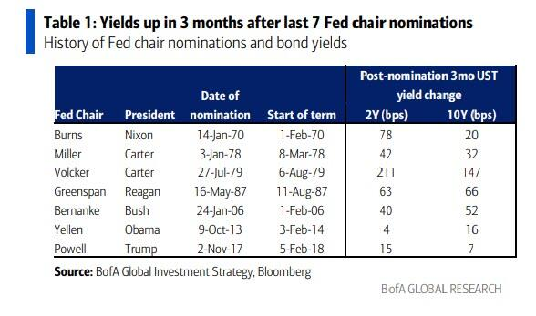 历史数据显示,自1970年以来的七次美联储主席提名(Burns、Miller、Volcker、Greenspan、Bernanke、Yellen、Powell)后三个月内,收益率每次都会上升,2年期收益率平均上升65个基点,10年期收益率平均上升49个基点。