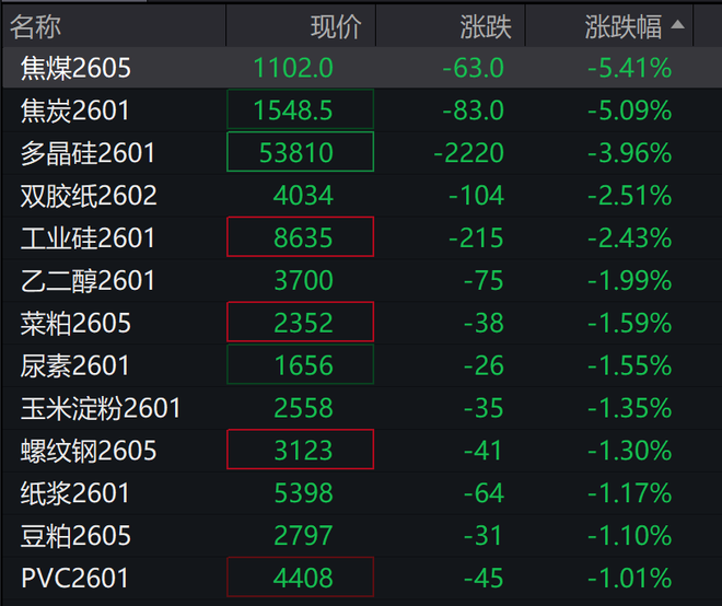商品期货开盘,焦煤主力合约跌超5%,焦炭跌超4%,乙二醇、淀粉、玉米、甲醇跌超1%。沪银涨超2%,LU燃油、沪铜涨超1%。