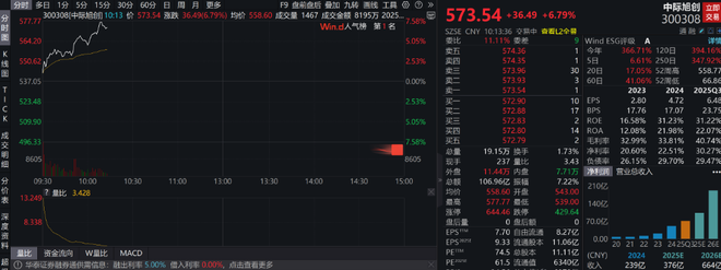 中际旭创成交额超100亿元,现涨超7%。