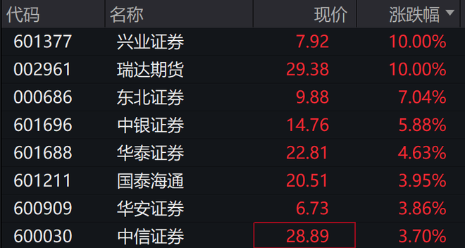 创业板指涨超1%。A股券商股再度拉升,兴业证券直线涨停,东北证券涨超7%,中银证券、华泰证券、国泰海通、中信证券、广发证券等跟涨。