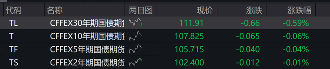 国债期货开盘多数下跌,30年期主力合约跌0.14%报112.410元,10年期主力合约跌0.02%报107.870元,5年期主力合约跌0.03%报105.725元,2年期主力合约涨0.01%报102.420元。