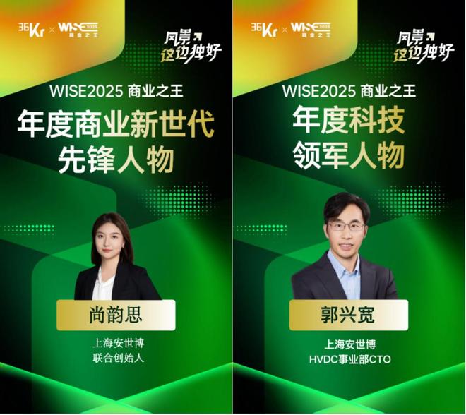 近期,在36氪启动的《WISE2025商业之王系列年度名册》评选中,安世博联合创始人尚韵思与数据中心供电事业部CTO郭兴宽,接连斩获两项商业新世代先锋人物与年度科技领军人物奖项。
