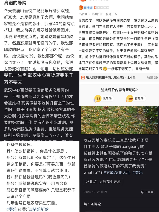 值得注意的是,类似的服务态度问题或并非孤例。在小红书等社交平台上,不乏消费者对斐乐门店服务态度的吐槽。