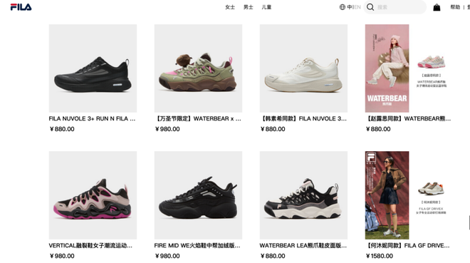 FILA官网数据显示,其男女士运动鞋价格在880元-1780元之间,儿童鞋的价位在480-1380元区间。