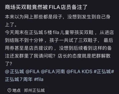 河南郑州一位顾客发帖,称在正弘城FILA KIDS门店为孩子购鞋。从进店、试穿到使用店员提议的优惠券完成购买,过程顺利。事后,顾客发现店员将其会员信息备注为“11.23号注册的,就买一双鞋子,一直嫌贵”,标签为“买双鞋子都嫌贵”,并将该截图误发至会员群。