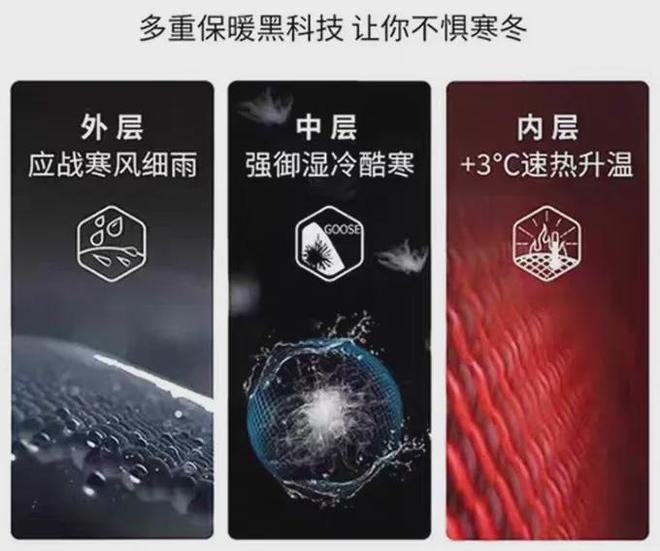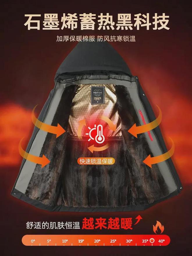 棉服背部上的黑金层,就是石墨烯发热面料,相当于一片自动发热的暖宝宝,源源不断地为你供暖。