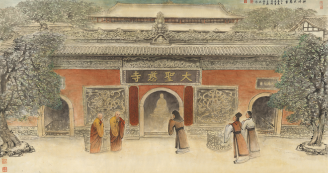 成都杜氏与三苏家族为世交。徐利明所书苏轼《书杜君懿藏诸葛笔》,便讲述了一件雅事:当年二苏赴京应试,世交杜叔元赠予东坡两支诸葛笔,这正是苏轼最为钟爱的笔。苏轼还与成都大慈寺宝月大师交情深厚,贬谪黄州后仍书信不断。谢泰伟《成都大慈寺》描绘了三苏出蜀前曾到访宝月大师主持之地。