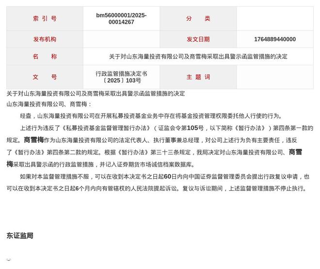 蓝鲸新闻12月10日讯,近日,山东证监局发布行政监管措施决定书,剑指山东海量投资有限公司及法定代表人商雪梅。