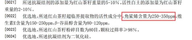 但是,当我们翻看林清轩的山茶花提取物制作、应用于精华油产品等核心专利,我们发现核心成分角鲨烯、维生素E、β-谷甾醇三大核心成分,在核心原料山茶花提取物中含量并不高。