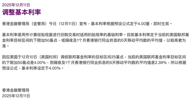 12月11日,香港金管局将基准利率下调25个基点至4.0%。