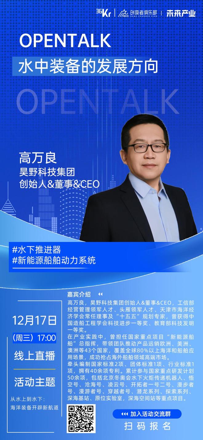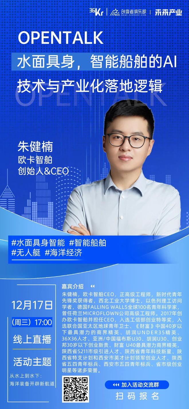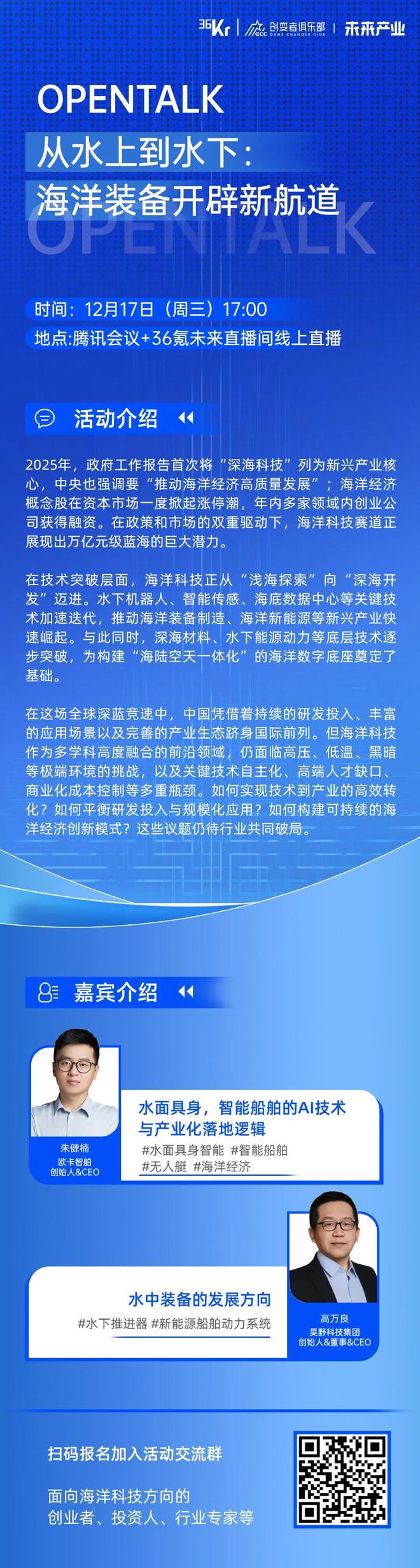2025年12月17日(周三)17:00,36氪OpenTalk举办「从水上到水下:海洋装备开辟新航道」直播活动,特别邀请欧卡智舶创始人&CEO朱健楠、昊野科技集团创始人&董事&CEO高万良两位嘉宾,分别围绕「水面具身,智能船舶的AI技术与产业化落地逻辑」、「水中装备的发展方向」两大主题,聚焦智能船舶、水面无人驾驶系统、水下推进器、新能源船舶动力系统等热点话题,探讨海洋科技的“破局点”与“未来式”。