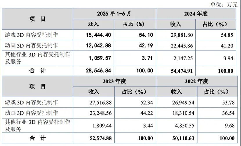 “游戏+动画”也成为原力数字的重要营收来源。其中,来自动画3D内容受托制作的收入正在稳步增长,2022年-2024年、2025年1-6月(下称“报告期”),分别为1.83亿元、2.32亿元、2.24亿元和1.2亿元。