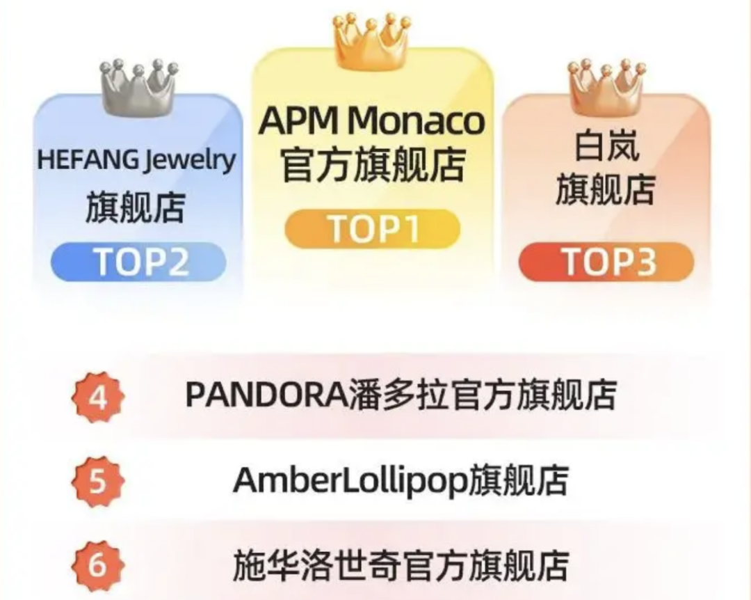 今年天猫珠宝饰品双十一店铺成交排行榜中,APM、HEFANG、白岚依次位居前三位,潘多拉和施华洛世奇则是第4名和第6名。