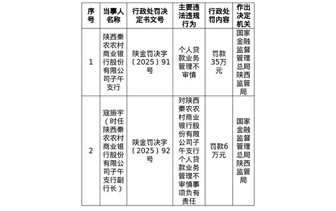 陕西秦农农商行子午支行因个人贷款业务管理不审慎被罚款35万