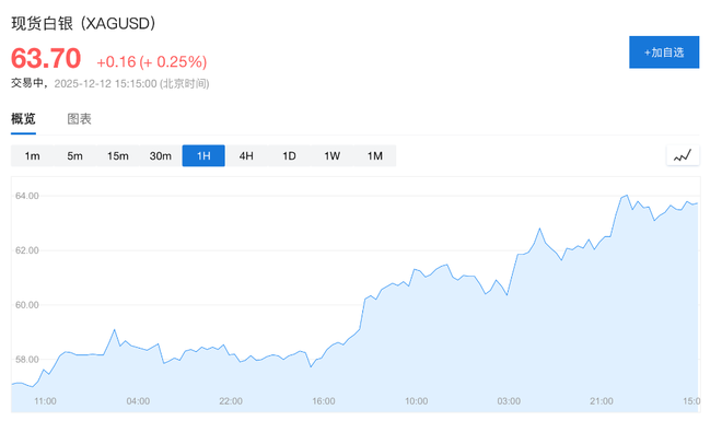 现货白银高位震荡,涨超0.2%至63.7美元/盎司。据华尔街见闻,自年初以来白银价格已经翻倍,严重的供需失衡构筑了坚实的基本面,地缘政治风险加剧了市场波动,散户的热情与“错失恐惧”心理进一步推升需求,而美联储降息周期可能引发的美元贬值预期,则扩大了其金融吸引力。![]()