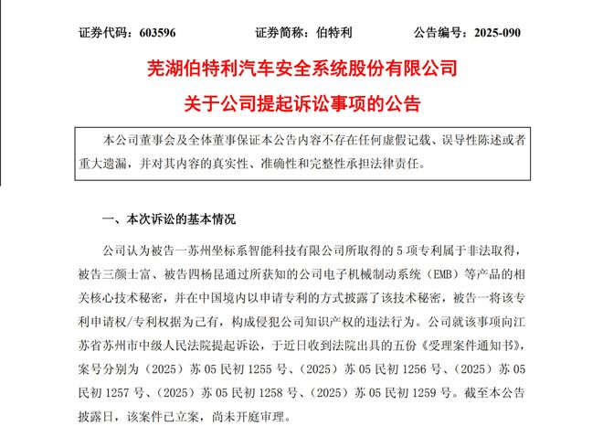 11月21日,芜湖伯特利汽车安全系统股份有限公司(以下称“伯特利”)发布公告,其作为原告,已向苏州坐标系智能科技有限公司(以下称“坐标系”)提起诉讼。缘由为侵犯知识产权,涉及坐标系名下多条有关电子机械制动系统(EMB)相关的技术专利。