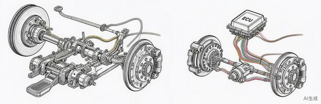 左为传统制动系统,右为EMB线控制动(图片由AI生成,仅供示意)