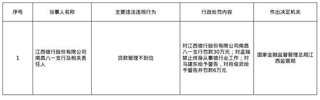 江西银行南昌八一支行因贷款管理不到位被罚30万