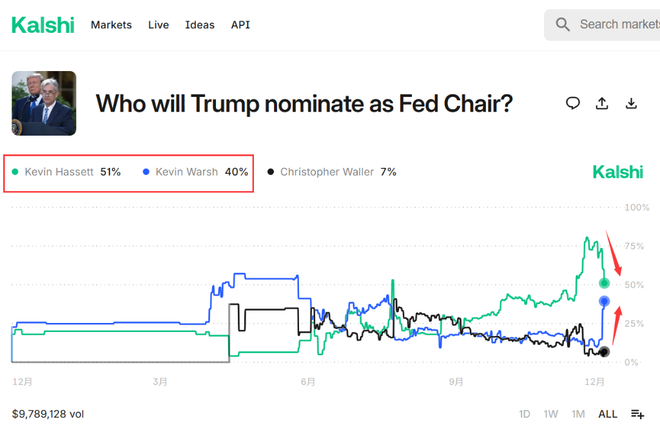 Kalshi预测市场的数据则更为直观,沃什与另一位热门人选哈塞特的获胜概率呈现此消彼长的态势,沃什获胜概率正在直线飙升,几乎就快追平哈塞特;而后者正在直线下降,不过其50%的获胜概率仍然领先全场。