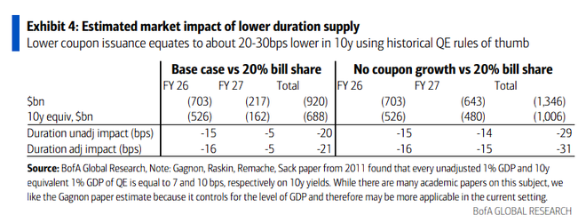 根据测算,在2026和2027财年,较高的国库券发行情形将比降至20%国库券占比的情形减少7000亿至1万亿美元的10年期等价供给。这种供给结构的差异将转化为10年期利率20-30个基点的净宽松效应。