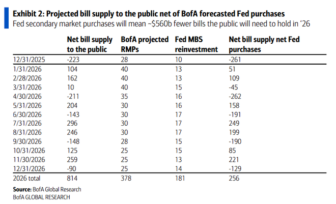 研报称,美联储本月开始实施RMPs计划,虽然这并非传统意义上的QE,但通过间接方式允许财政部增加短期国库券发行,同时减少中长期债券供给。美银预计,2026年美联储将通过RMPs和MBS再投资总计购买5600亿美元国库券,与此同时财政部计划增发5000亿美元国库券,减少6000亿美元中长期债券发行。