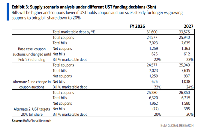据美银的情景分析显示,在基准情形下,财政部将在2027年2月的债券发行会议开始增加2-7年期债券的拍卖规模。但在替代情形中,如果财政部继续保持中长期债券拍卖规模不变,或者采取将国库券供给降至20%长期平均水平的策略,市场影响将显著不同。