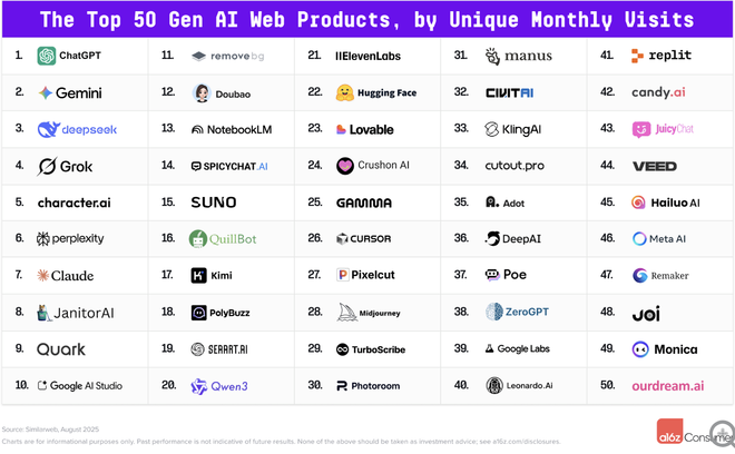 谷歌首次以独立域名形式在榜单中占据四个席位,展现其AI产品矩阵化布局效果。除Gemini外,面向开发者的AI Studio首次进入前10,学术研究工具NotebookLM排名第13,AI实验平台Google Labs位列第39。