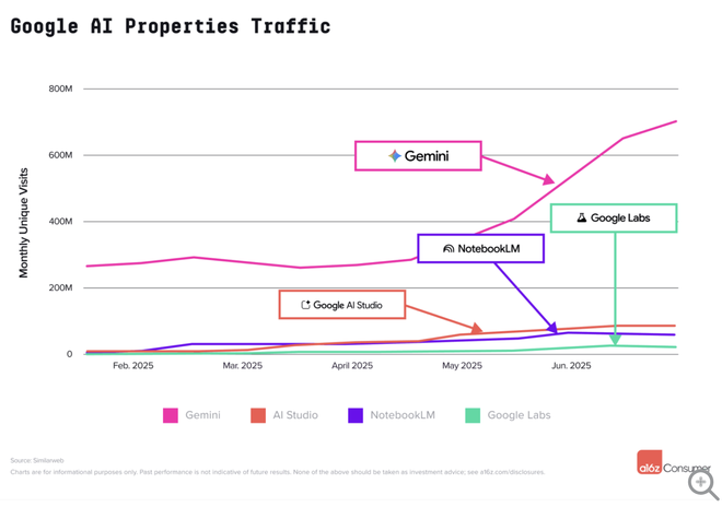 AI Studio作为面向开发者的沙盒平台成功跻身前10,该平台支持用户构建Gemini多模态模型应用。NotebookLM在从Google Labs独立后排名第13位,这一学术研究工具在近一年来稳步增长,仅在夏季学术用户流失期间略有下滑。