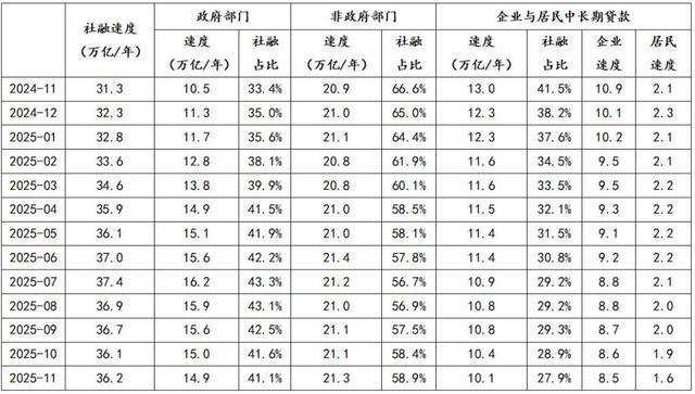 截至11月末,社融投放的速度仍稳定在36万亿/年水平的上方。其中,政府部门的融资速度保持在15万亿/年,非政府部门融资速度为21万亿/年,但企业和居民的中长期贷款的速度已降至10.1万亿/年,而且是连续5个月下降,已大幅低于去年同期的13万亿/年,反映出推动经济内生增长的有效融资面临不小的下行压力。从过去两个月的态势来看,到年底,社融投放速度可能会降至36万亿/年以下的水平。