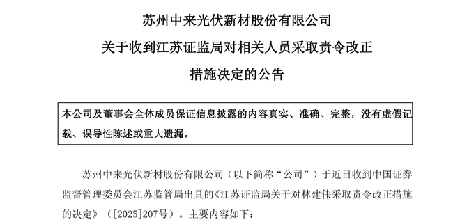 12月15日晚间,中来股份(300393)发布公告称,公司副董事长兼总经理林建伟未按承诺履行差额补足义务,被采取责令改正的行政监管措施。