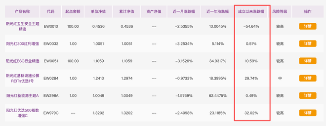 从数据上看,光大理财权益产品表现分化比较明显,两只产品徘徊在跌破净值边缘,阳光红卫生安全主题精选成立以来跌幅高达54.64%,净值已遭腰斩。