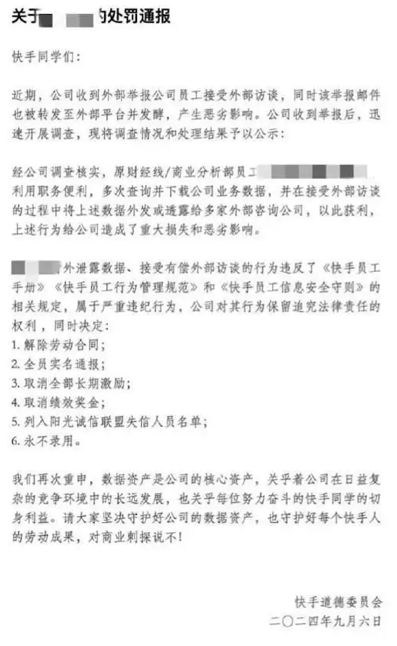 此后,快手发布处罚通报称,经调查核实,原财经线/商业分析部某员工利用职务便利,多次查询并下载公司业务数据,并在接受外部访谈的过程中将上述数据外发或透露给多家外部咨询公司,以此获利。快手决定对其,解除劳动合同;全员实名通报;取消全部长期激励;取消绩效奖金;列入阳光诚信联盟失信人员名单;永不录用。