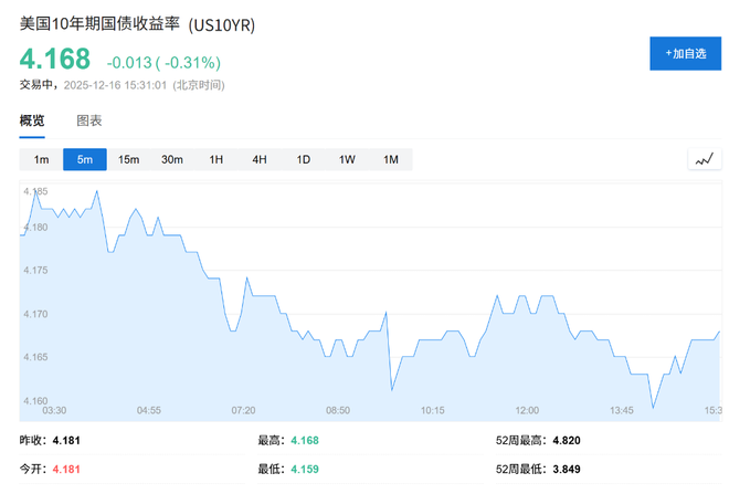美国10年期国债收益率稳定在4.17%左右。尽管通胀显示出粘性迹象,但市场仍押注美联储通过明年两次降息来支持就业市场。