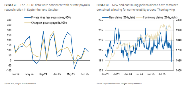一方面,初请失业金人数在11月调查窗口期明显低于9月和10月,四周均值持续回落;10月JOLTS职位空缺小幅回升,显示企业并未大规模裁员。