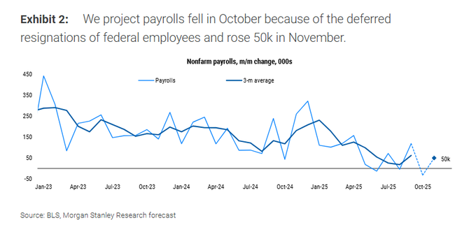 高盛预计10月非农就业仅增加1万(私人部门增7万),11月增加5.5万(私人部门增5万),略高于市场共识但低于前三个月平均水平。摩根士丹利则预测10月就业减少3万、11月增加5万,预计失业率将升至4.6%。