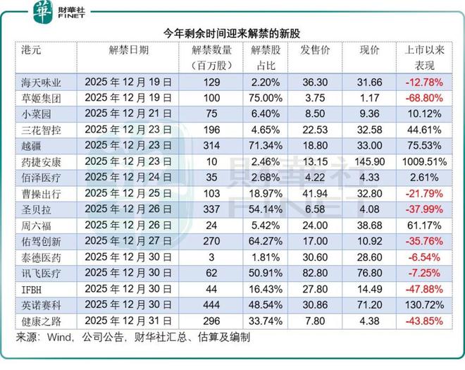 根据我们的统计,2025年12月16日至31日,将有超过十家上市公司的重要股东持股陆续解禁,包括海天味业(03288.HK)、草姬集团(02593.HK)、三花智控(02050.HK)、越疆(02432.HK)、药捷安康-B(02617.HK)、曹操出行(02643.HK)、周六福(06168.HK)、英诺赛科(02577.HK)等等,涉及股份数量从数百万到数亿股不等。市场普遍关注,这批“解锁”的股份会否引发抛售潮,进而冲击相关个股乃至大市表现。