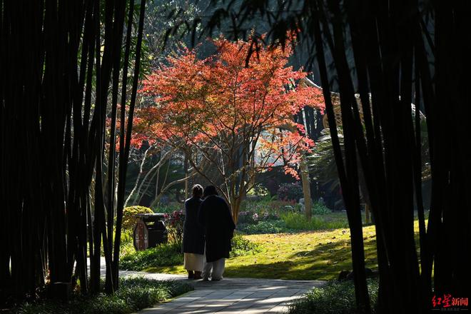 ▲12月7日,成都,冬日暖阳照在望江楼公园枫叶上