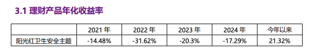 资料显示,阳光红卫生安全主题精选发行于2020年5月,是光大理财成立最早的一只权益产品。成立五年多以来,2021-2024年收益率均为负值,仅今年以来实现了正收益。