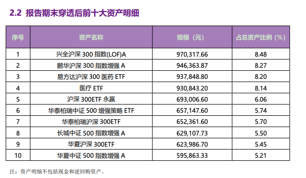 据该产品2025年第三季度报告,截至9月末,该产品规模1140.77万元,前十大持有资产主要以医药ETF和多家基金公司沪深300ETF及中证500指数增强基金为主。