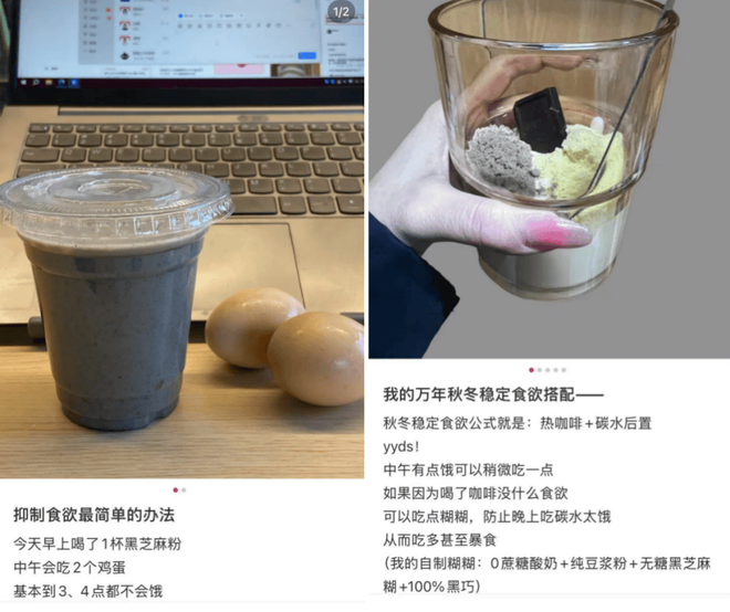 白领打工人液断的食谱中,除了DIY奶茶食谱、自制东方树叶奶茶外,还添加了一些古早产品的身影,例如无糖版南方黑芝麻糊。